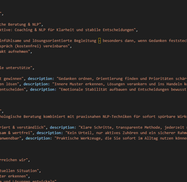 - Kontakt: Badge „Beratung & NLP“, animierte Notiz, Verfügbarkeit/Reaktionszeit, clientseitig zusammengesetzter Mailto-Link.