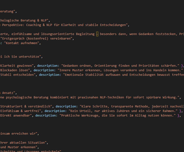 - Home: Hero-Claim, CTA zum Kontakt, Highlights (Klarheit, Blockaden lösen, stabil entscheiden), „Mein Ansatz“ mit Benefits, Schritte und Erwartungen.