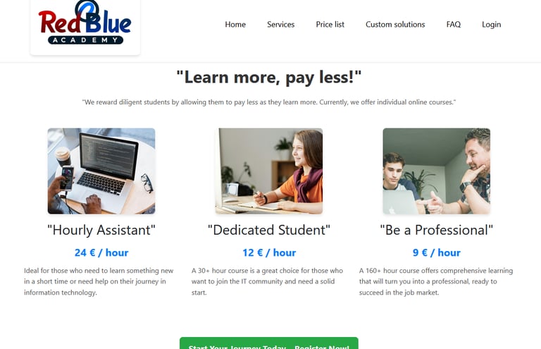 Die RedBlue Academy ist eine innovative Webanwendung, die es Schülern und Lehrkräften erleichtert, Unterrichtsreservierungen und Lernstunden zu verwalten. Mit Fokus auf Benutzerfreundlichkeit gestaltet, vereinfacht diese Plattform das Lernerlebnis, indem sie es den Nutzern ermöglicht, Unterrichtseinheiten passend zu ihrem Zeitplan zu buchen und gleichzeitig ihre Lernstunden effizient zu verfolgen.