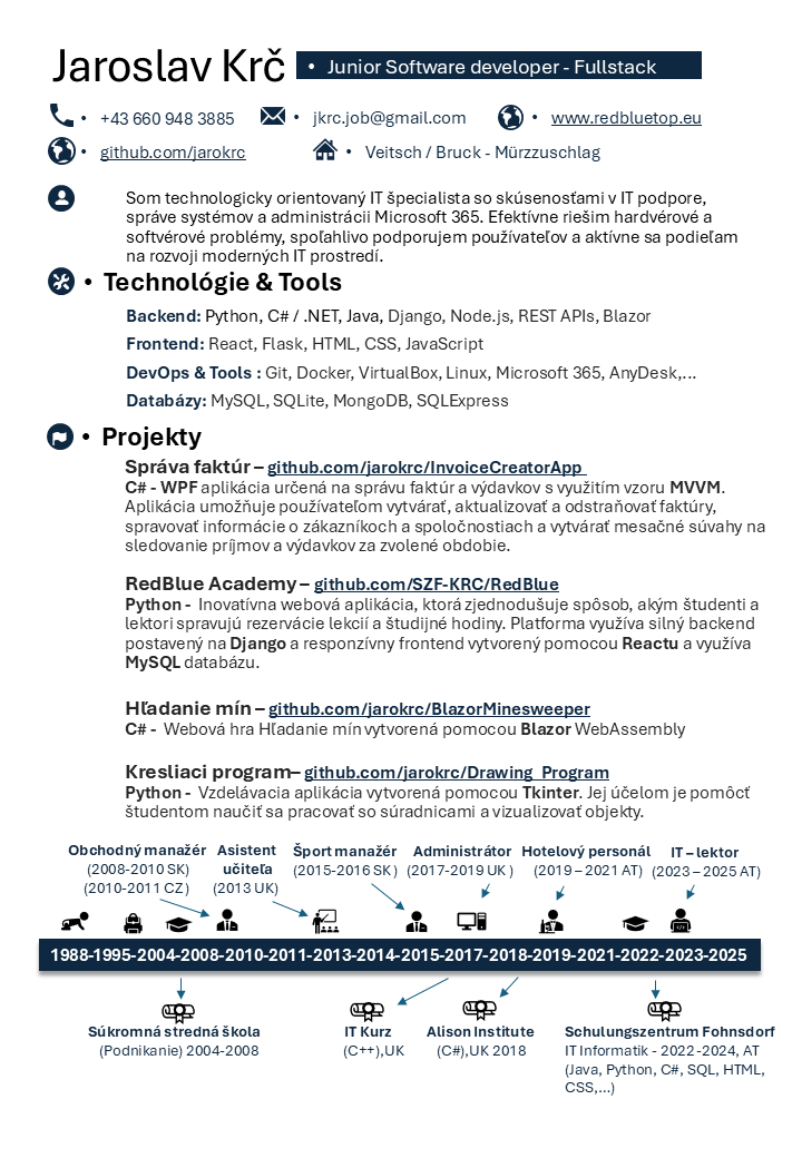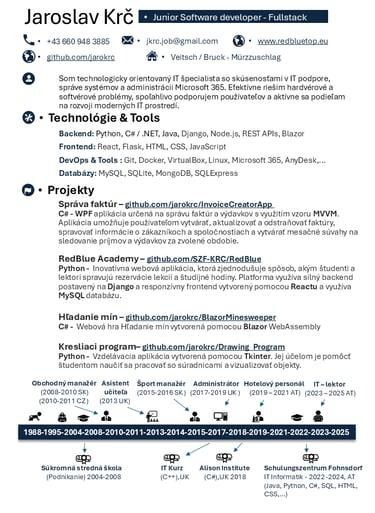 Programovanie pre mňa nie je len práca, ale aj dlhoročná vášeň. Baví ma spájať technickú stránku (backend, databázy, infraštruktúra) s tým, aby výsledok bol zrozumiteľný a použiteľný pre bežného človeka.